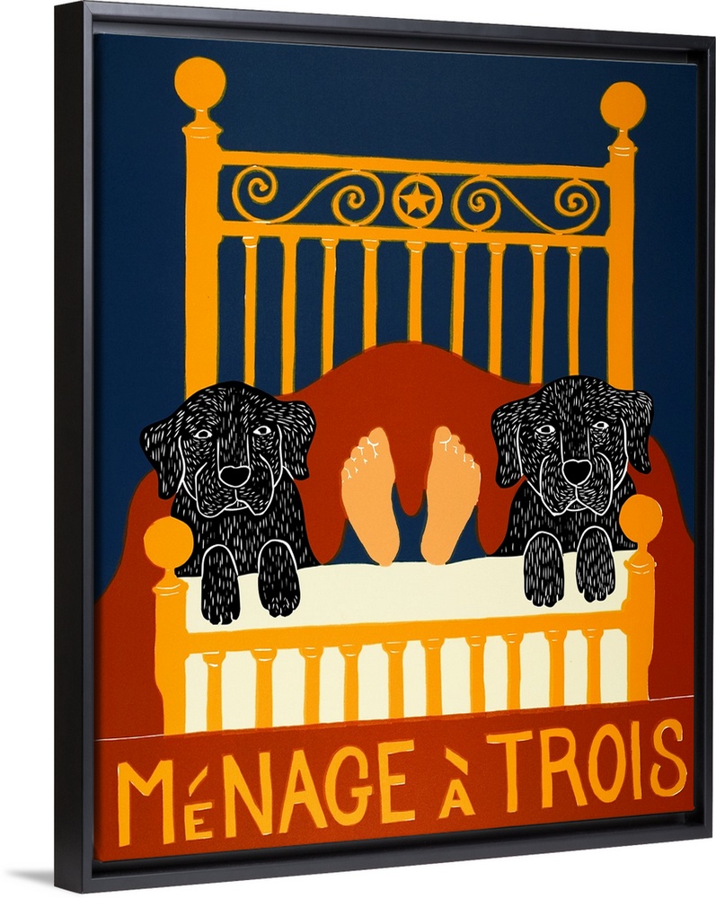 <p>Illustration of two black labs laying next to their owners legs at the foot of the bed with the phrase "Menage a Trois" written on the bottom.</p>
