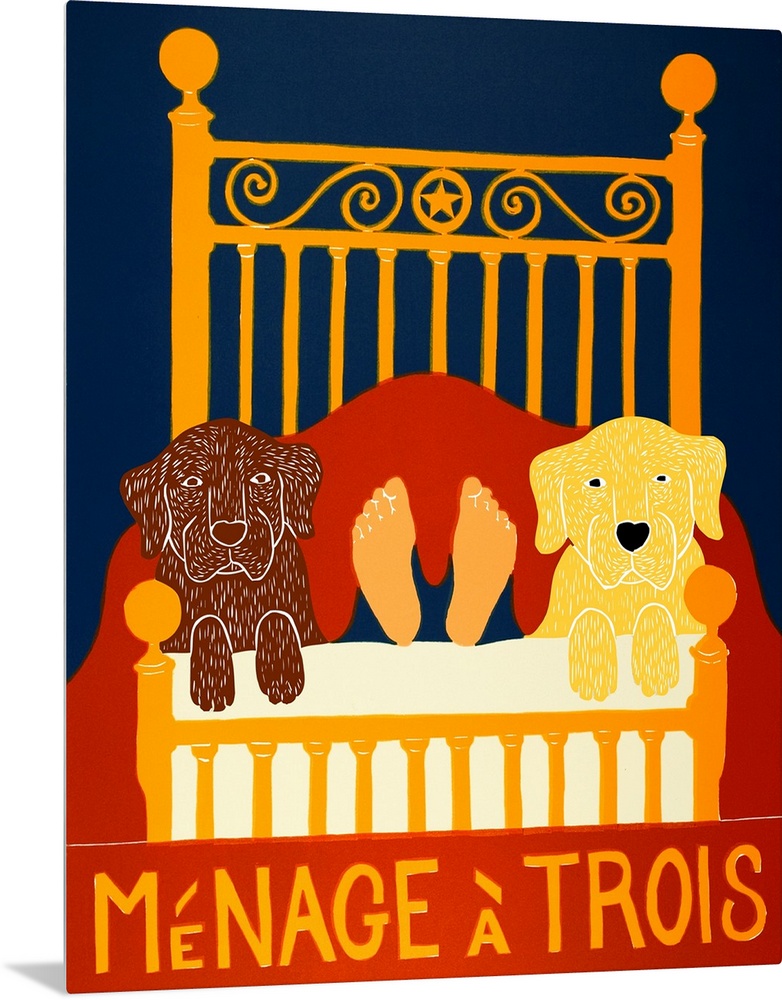 <p>Illustration of a yellow and chocolate lab laying next to their owners legs at the foot of the bed with the phrase "Menage a Trois" written on the bottom.</p>