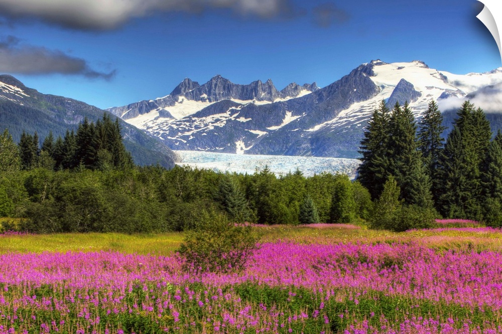 <p>View Of The Mendenhall Glacier With A Field Of Fireweed In The Foreground, Southeast, Alaska Summer, Hdr Image</p>