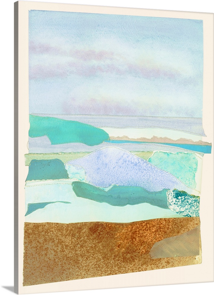 <p>Serene mixed-media collage depicting a layered abstract landscape with soft blues, turquoises, and earthy browns, featuring textured shapes and delicate stitching.</p>