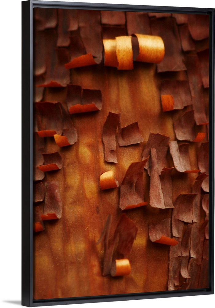 <p>Portrait, close up photograph of many small pieces of bark, curling as they peel away from a Menzanita tree.</p>