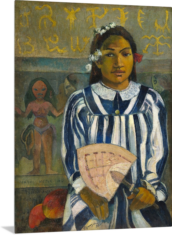 <p>Paul Gauguin traveled to rural France and then abroad in search of inspiration for his art. His quest took the former stockbroker to the French regions of Brittany and Provence, to Panama and Martinique, and finally to Tahiti and the Marquesas in the South Pacific. This stately portrait of Gauguin's young Tahitian vahineo (lover), Tehamana, is perhaps a farewell, since it was painted shortly before the artist left the island, returning to France for two years. Elaborately dressed, her hair decorated with flowers, Tehamana is seated in front of a mysterious painted background reminiscent of a frieze on the wall of an ancient palace or temple. Two ripe mangoes - perhaps an offering or symbol of fertility - rest beside her hip. She points a fan, an emblem of beauty, toward the similarly frontal figure of a goddess, who also wears a red flower in her hair. The fan, flowers, fruit, and even Tehamana's glance suggest not only the strong, enigmatic bond between these two figures but also the connections between the present and the past, the corporeal and the spiritual, and the living and the dead.</p>