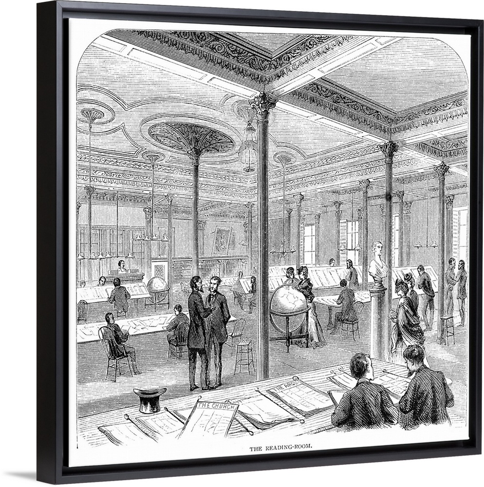<p>The reading room of the New York Mercantile Library on Astor Place. Wood engraving, American, 1871.</p>