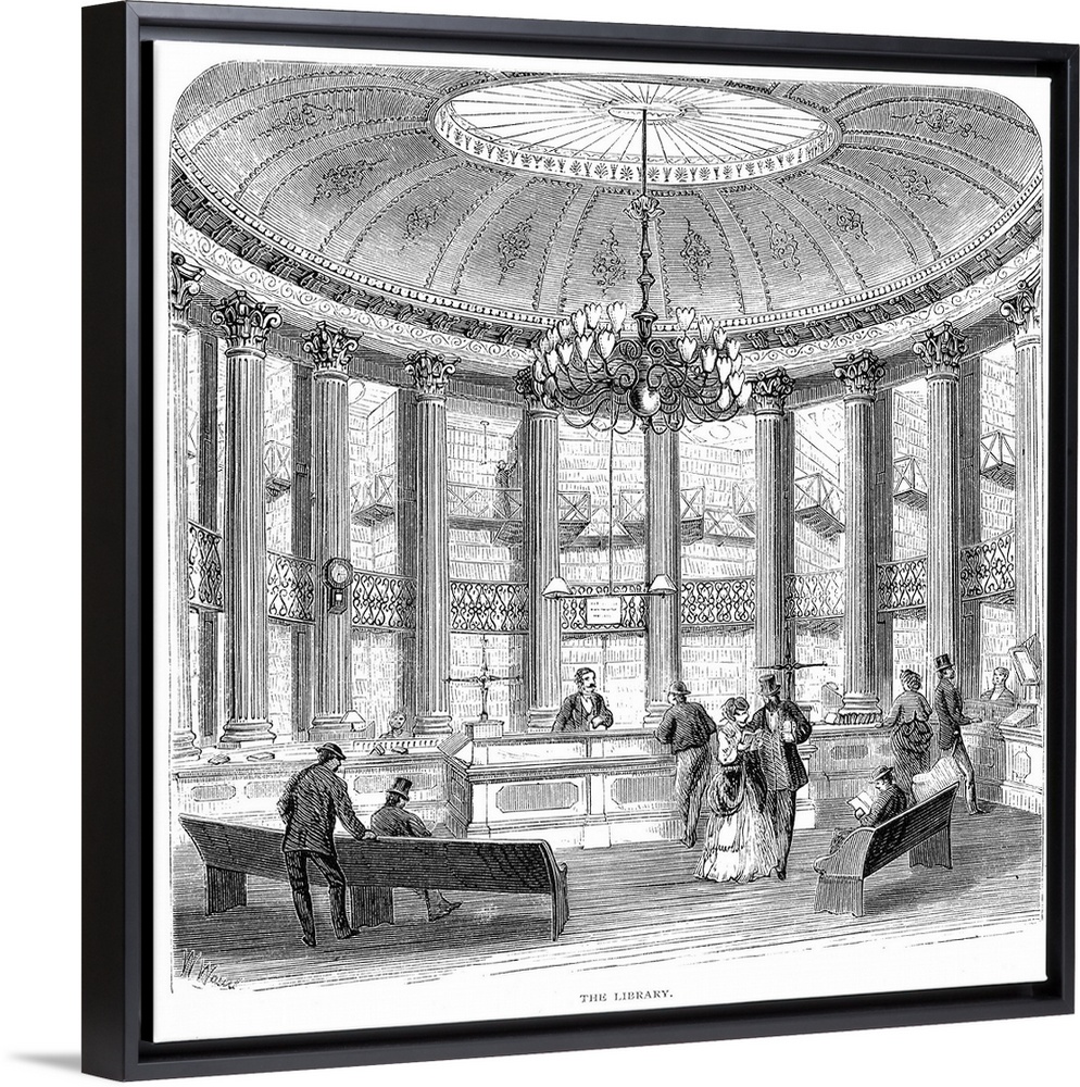 <p>The interior of the New York Mercantile Library at Astor Place. Wood engraving, American, 1871.</p>