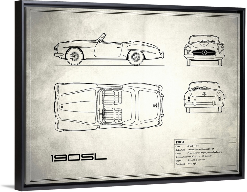 <p>Antique style blueprint diagram of a Mercedes 190 SL printed on a weathered white and gray background.</p>