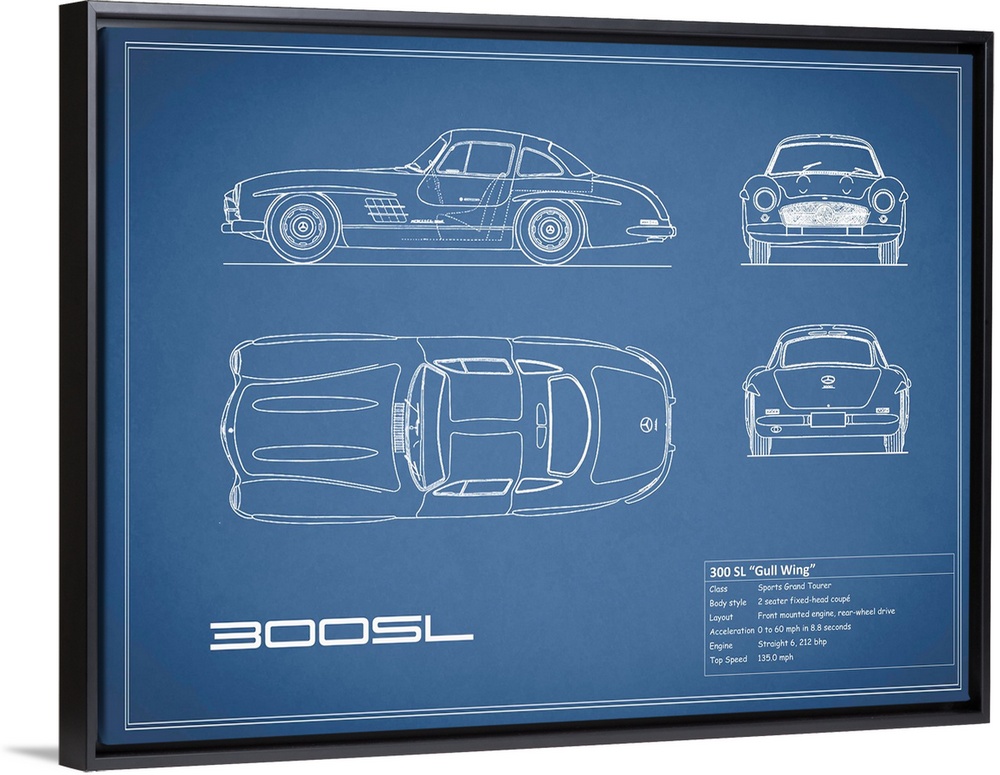 <p>Antique style blueprint diagram of a Mercedes 300SL Gullwing printed on a Blue background</p>