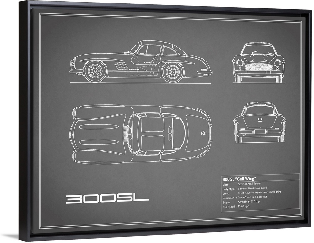 <p>Antique style blueprint diagram of a Mercedes 300SL Gullwing printed on a Grey background</p>