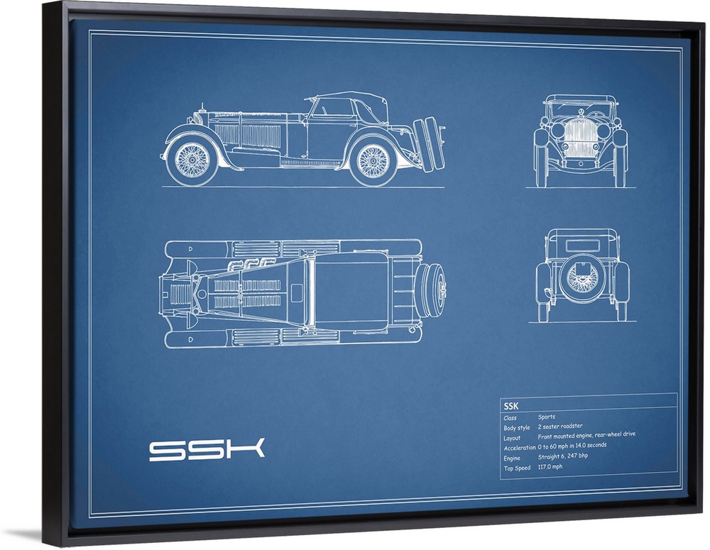 <p>Antique style blueprint diagram of a Mercedes SSK printed on a Blue background</p>