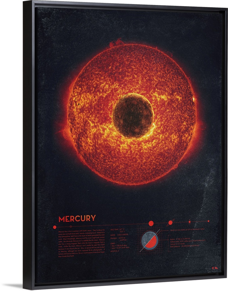 <p>Educational graphic poster of Mercury with written facts at the bottom including average temperature, mass, diameter, orbit, and a diagram. Write up reads: "Mercury has a lot in common with Earth?s moon. They?re about the same size and both have solid, heavily-cratered ground. Instead of a thick atmosphere, both have a thin layer of atoms generated by solar wind. Most interestingly, Mercury and the moon might both contain water. But obviously Mercury isn?t a satellite like the moon. Mercury also has a strong magnetic field while the moon?s magnetic field is weak. Unlike the moon, Mercury can?t usually be seen from Earth because it?s too close to the sun. Also, no spacecraft has ever landed on Mercury, although two have captured fly-by photographs. If humans did land on Mercury, the sun would appear three times larger than it looks from Earth."</p>