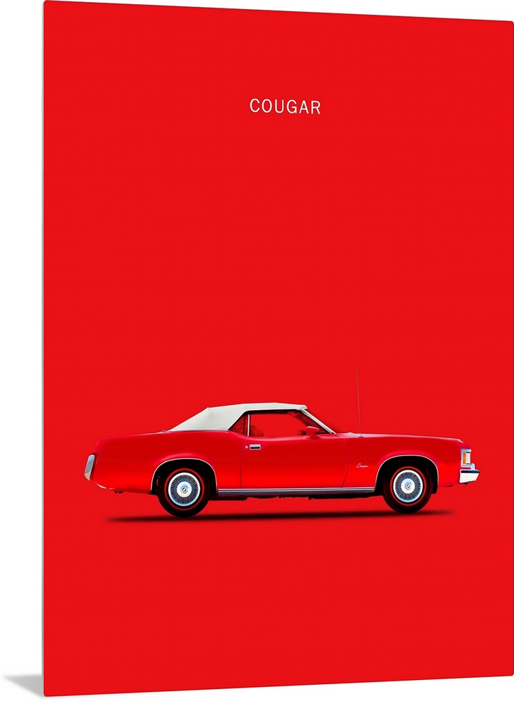 <p>Photograph of a red Mercury Cougar 1973 with a white hood printed on a red background</p>