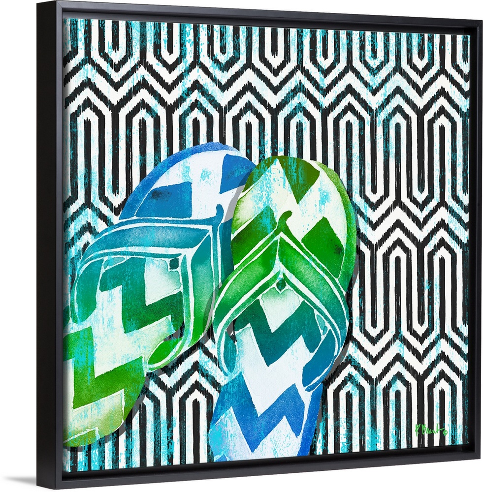 <p>Bright watercolor sandals over a black and white geometric background.</p>