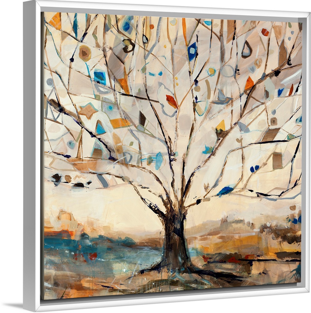 <p>Large square contemporary art displays a Merkaba tree filled with birds that is surrounded by a desolate landscape.</p>