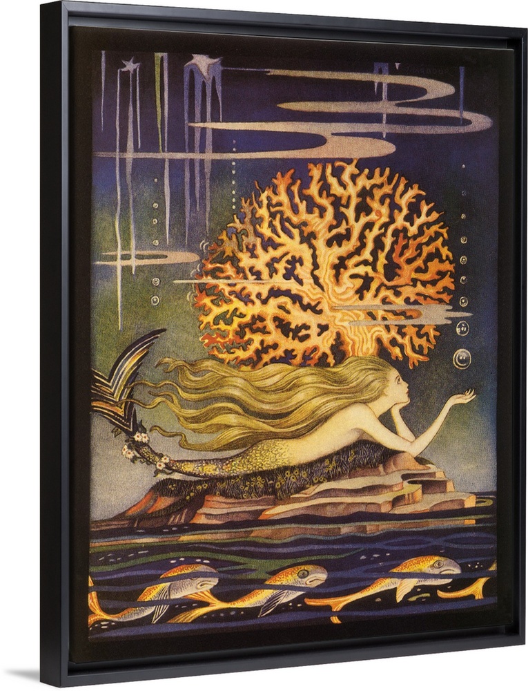 <p>A vintage illustration of a whimsical looking mermaid swimming beside a golden reef.</p>