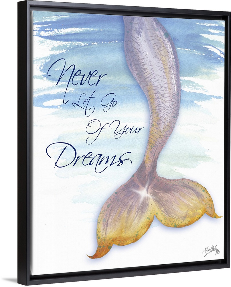 <p>"Never Let Go Of Your Dreams" with a watercolor painting of a mermaid tail.</p>