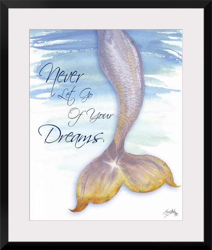 <p>"Never Let Go Of Your Dreams" with a watercolor painting of a mermaid tail.</p>