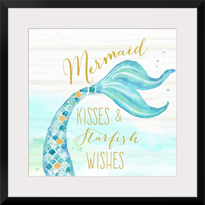 <p>"Mermaid Kisses & Starfish Wishes" in gold with a watercolor design of a mermaid tail against a white wood backdrop.</p>