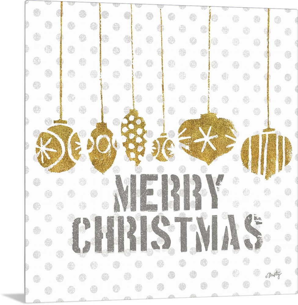 <p>Hanging ornaments in gold glitter coloring hover over the holiday sentiment: Merry Christmas, with a polka dot background.</p>