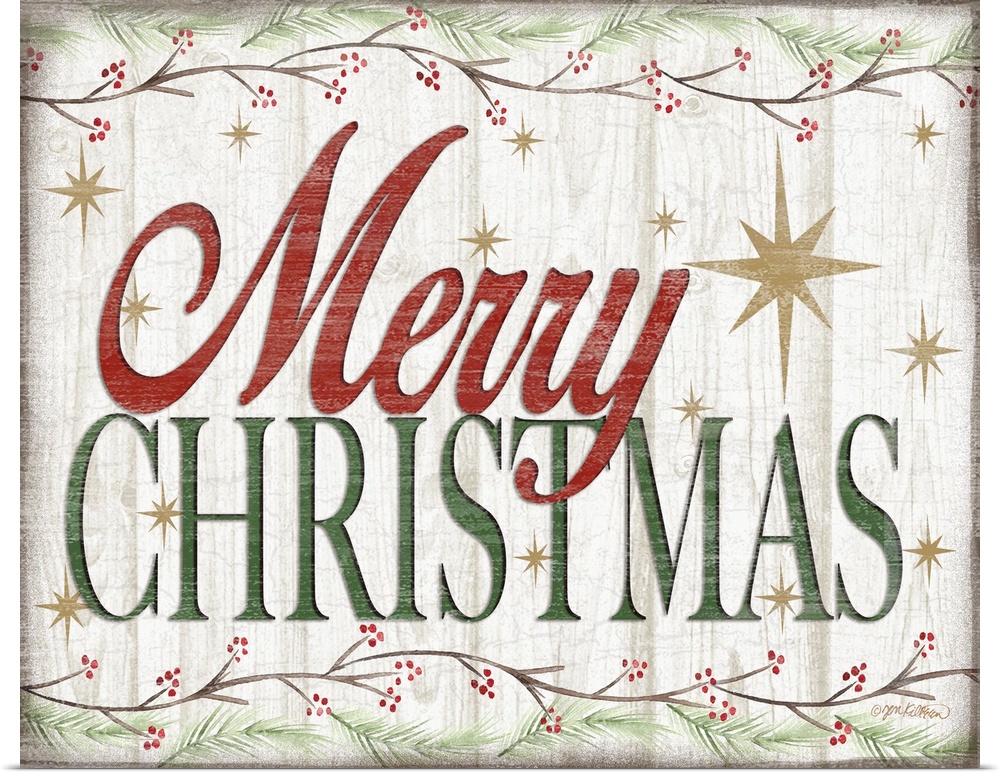 <p>"Merry Christmas" in red and green bordered by holly branches and surrounded by gold stars with a distressed overlay.</p>