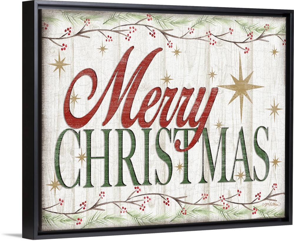 <p>"Merry Christmas" in red and green bordered by holly branches and surrounded by gold stars with a distressed overlay.</p>