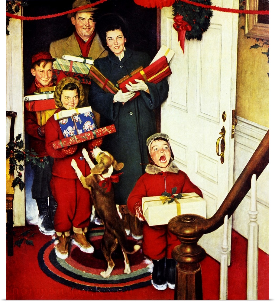 <p>Leave it to the youngest member of the family to spill the beans of the "big news" immediately upon entry. It appears that the dog is either theirs, already anxious to leave-or is Grandma's, greeting the visitors and perhaps suggesting that the present-laden crew stop to shuck their snowy boots before making a wet mess of Grandma's shocking red flooring. Approved by the Norman Rockwell Family Agency.</p>