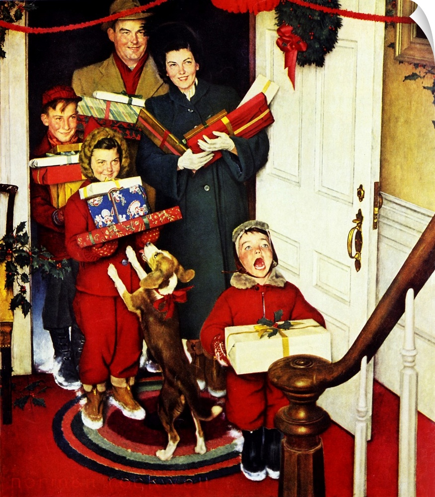 <p>Leave it to the youngest member of the family to spill the beans of the "big news" immediately upon entry. It appears that the dog is either theirs, already anxious to leave-or is Grandma's, greeting the visitors and perhaps suggesting that the present-laden crew stop to shuck their snowy boots before making a wet mess of Grandma's shocking red flooring. Approved by the Norman Rockwell Family Agency.</p>