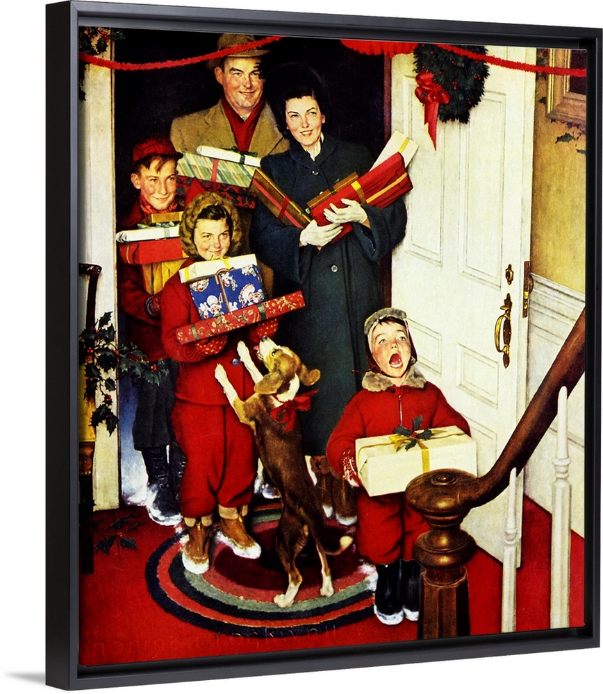 <p>Leave it to the youngest member of the family to spill the beans of the "big news" immediately upon entry. It appears that the dog is either theirs, already anxious to leave-or is Grandma's, greeting the visitors and perhaps suggesting that the present-laden crew stop to shuck their snowy boots before making a wet mess of Grandma's shocking red flooring. Approved by the Norman Rockwell Family Agency.</p>