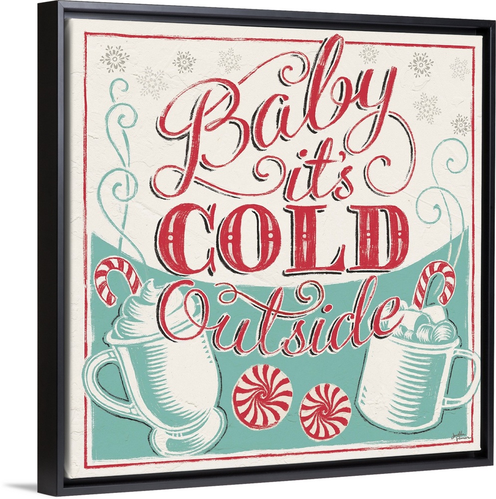 <p>A modern decorative design in teal and red of peppermints and drink mugs with the text "Baby it's Cold Outside".</p>