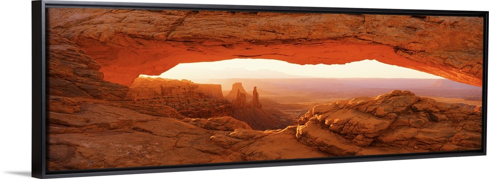 <p>Panoramic photograph of gorge from behind a huge flattened stone archway.</p>