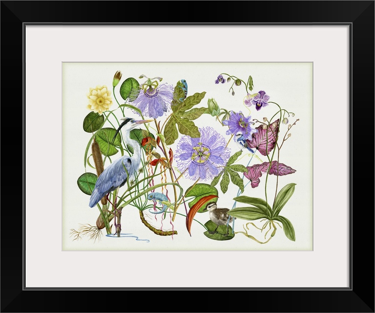 <p>Vintage style artwork of a blue heron with a variety of botanical drawings.</p>
