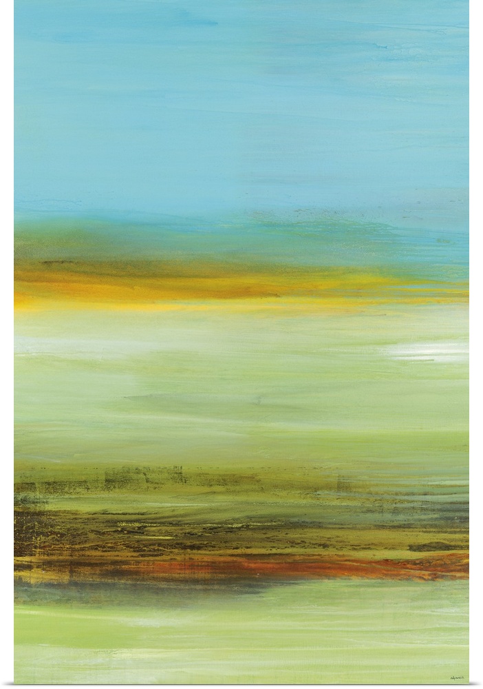 <p>Abstract artwork with different colors painted horizontally that divides up the larger areas of blue and grey.</p>