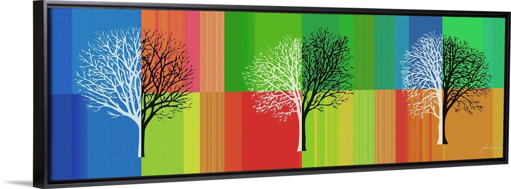 <p>An abstract tree silhouette on a brightly colored striped background.</p>