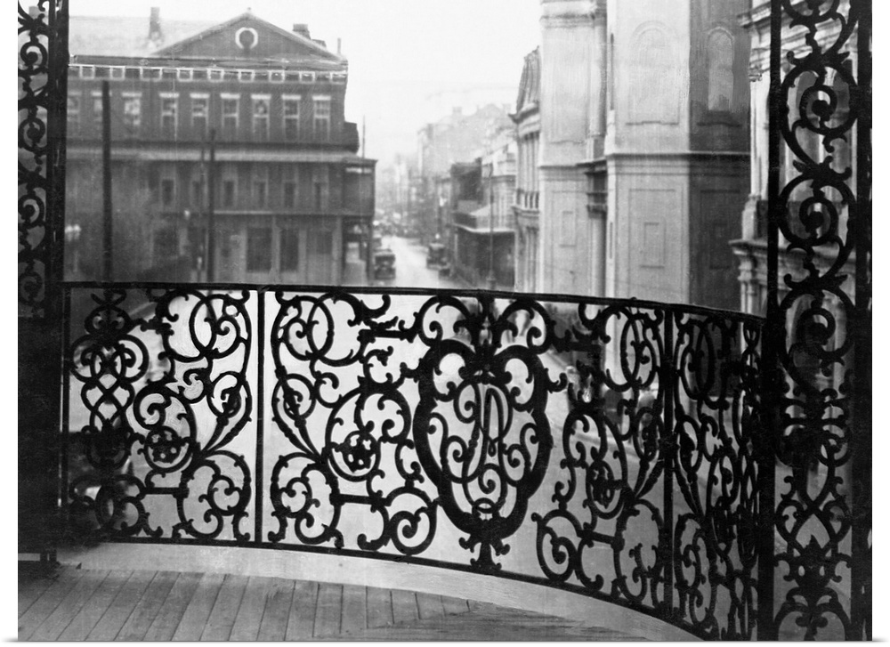 <p>An elaborate metal filigree railing adorns the second story of this historical building overlooking the street in New Orleans.</p>