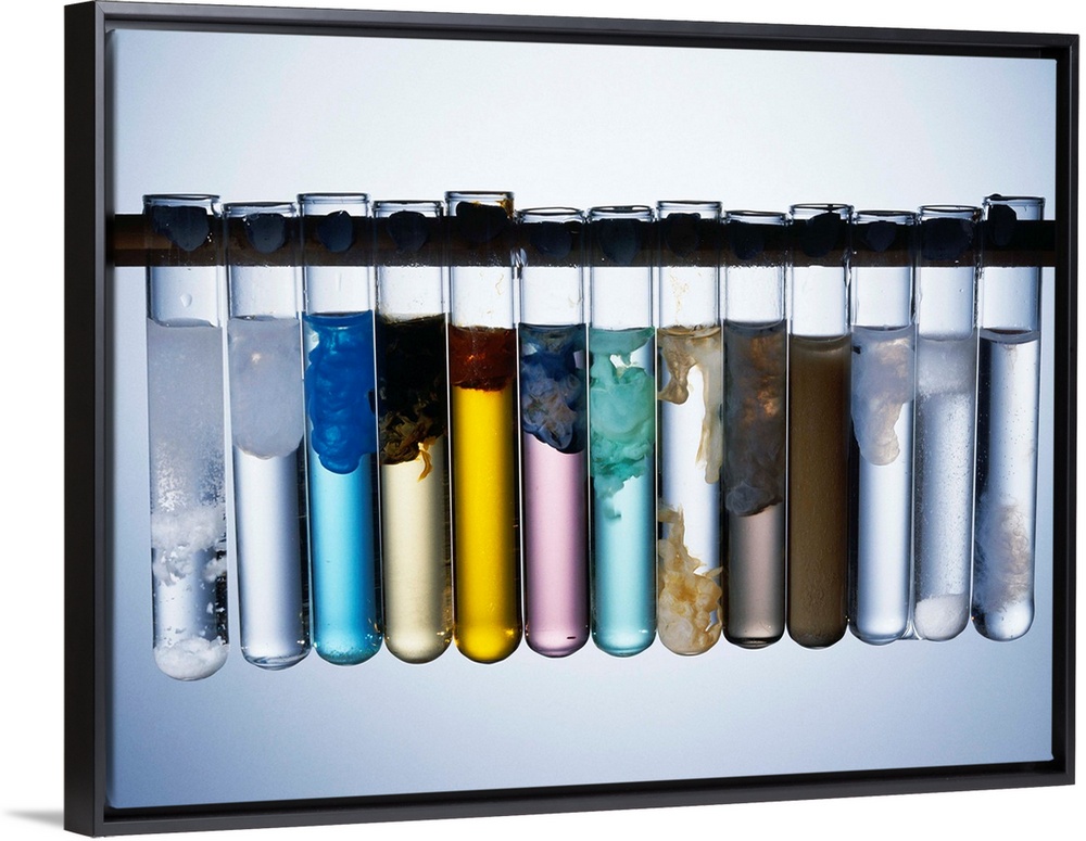 <p>Metal hydroxides, image 2 of 2, formed from the addition of sodium hydroxide (NaOH) to solutions containing metal ions. From left to right are precipitates of: calcium (Ca(OH2)), magnesium (Mg(OH)2), copper (Cu(OH)2), iron (II) (Fe(OH)2), iron (III) (Fe(OH)3), cobalt (Co(OH)2), nickel (Ni(OH)2), manganese (Mn(OH)2), chromium (Cr(H2O)3(OH)3), silver (AgOH), Zinc (Zn(OH)2), lead (Pb(OH)2) and aluminium (Al(OH)3) hydroxides. The addition of NaOH is used to discover the identity of metal ions in solution, as the resulting precipitates have unique characteristics, for example colour and degree of solubility. See A500/418 for start of reaction.</p>