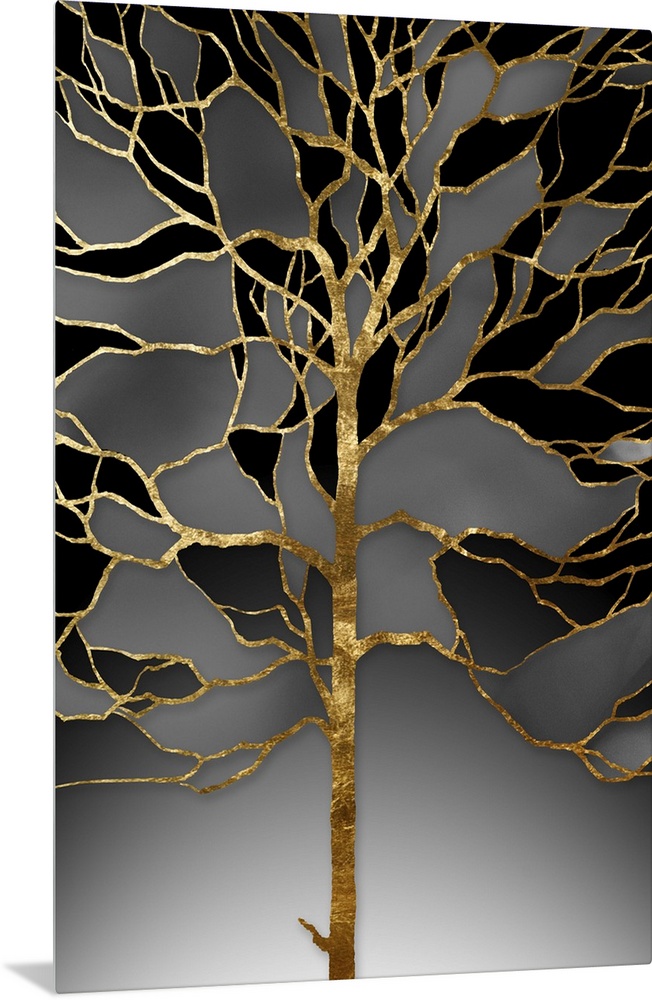 <p>A modern design of a tree of metallic gold with shades of gray and black between the branches.</p>