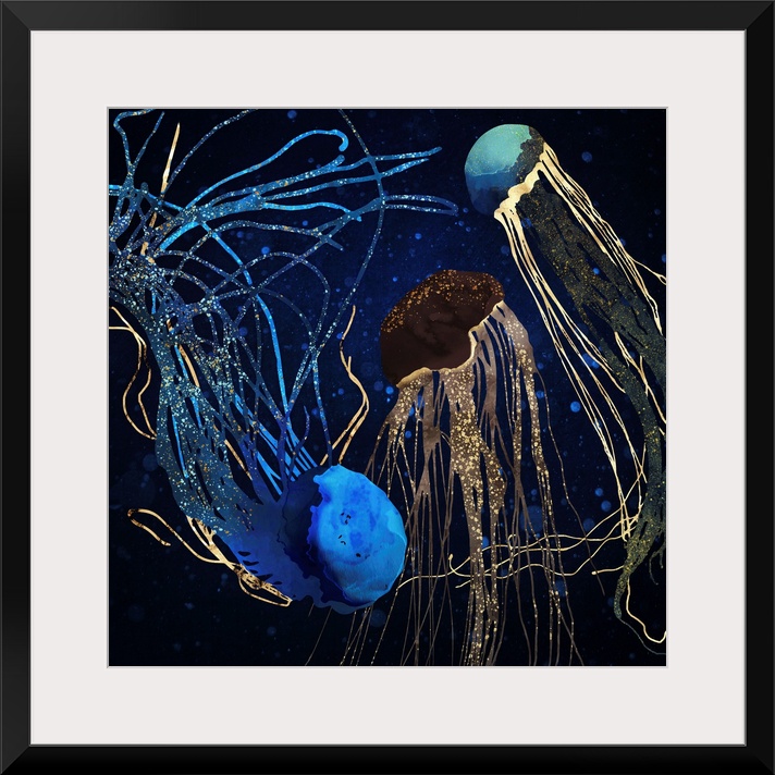 <p>Abstract depiction of jellyfish with gold, blue, brown, teal, navy and water.</p>