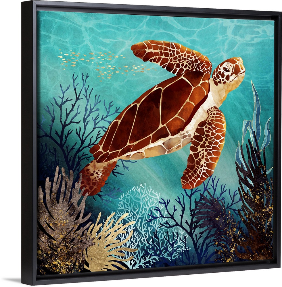 <p>Abstract underwater depiction of a sea turtle with coral, blue, aqua, gold and amber.</p>