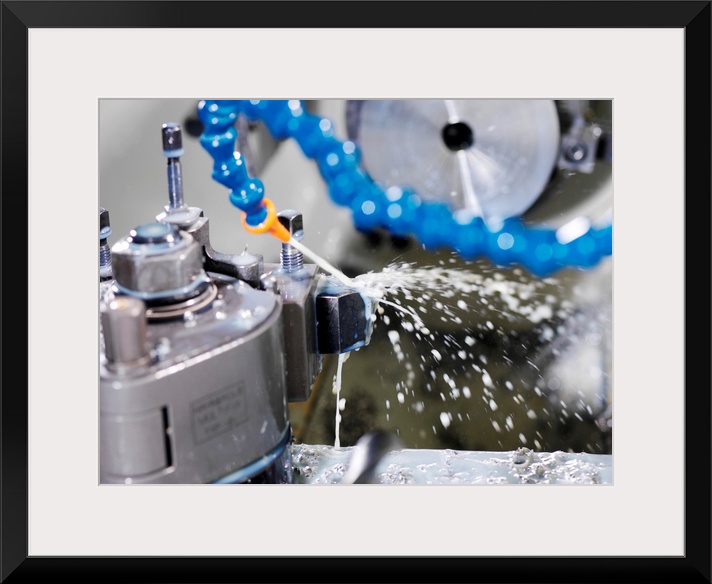 <p>Metalwork. Cutting fluid being pumped over the cutting site on a CNC (computer numerical control) lathe as it machines a metal component. The fluid cools and lubricates the cutting area and washes away the shavings. CNC lathes are controlled electronically. The design for the component is uploaded to the machine and used to control the cutting device.</p>