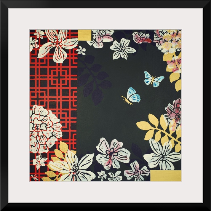 <p>Painting of two butterflies flying in garden of peonies with nacvy background and red screen.</p>