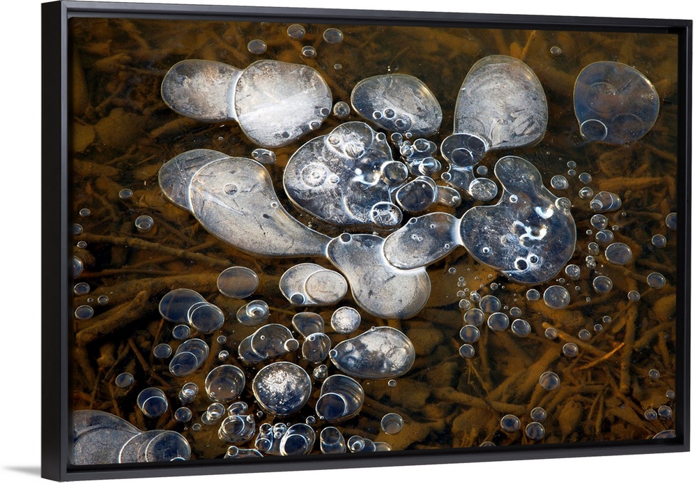 <p>Methane bubbles trapped in a frozen pool. These are produced by decomposing organic matter at the bottom of the pond.</p>