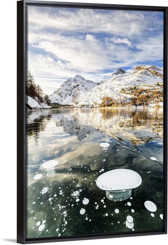 <p>Methane bubbles in the icy surface of Silsersee with snowy peak, Lake Sils, Engadine Valley, Graubunden, Swiss Alps, Switzerland, Europe</p>