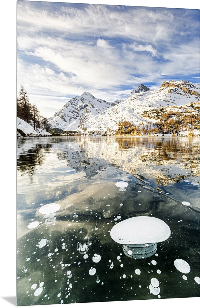 <p>Methane bubbles in the icy surface of Silsersee with snowy peak, Lake Sils, Engadine Valley, Graubunden, Swiss Alps, Switzerland, Europe</p>