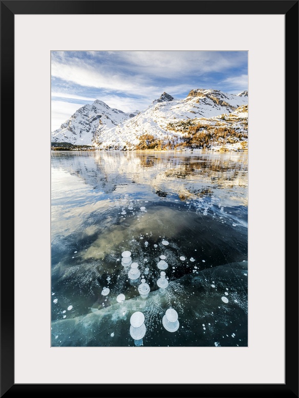 <p>Methane bubbles in the icy surface of Silsersee with snowy peak, Lake Sils, Engadine Valley, Graubunden, Swiss Alps, Switzerland, Europe</p>