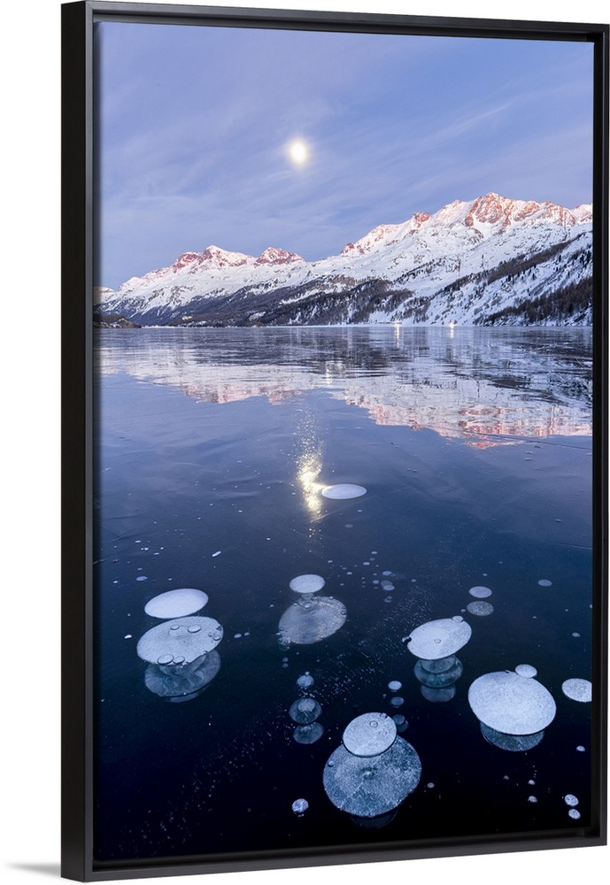<p>Methane bubbles in the icy surface of Silsersee with snowy peak illuminated by sunset and moon in the sky. Lake Sils, Engadin Valley, canton of Graubunden, Switzerland</p>