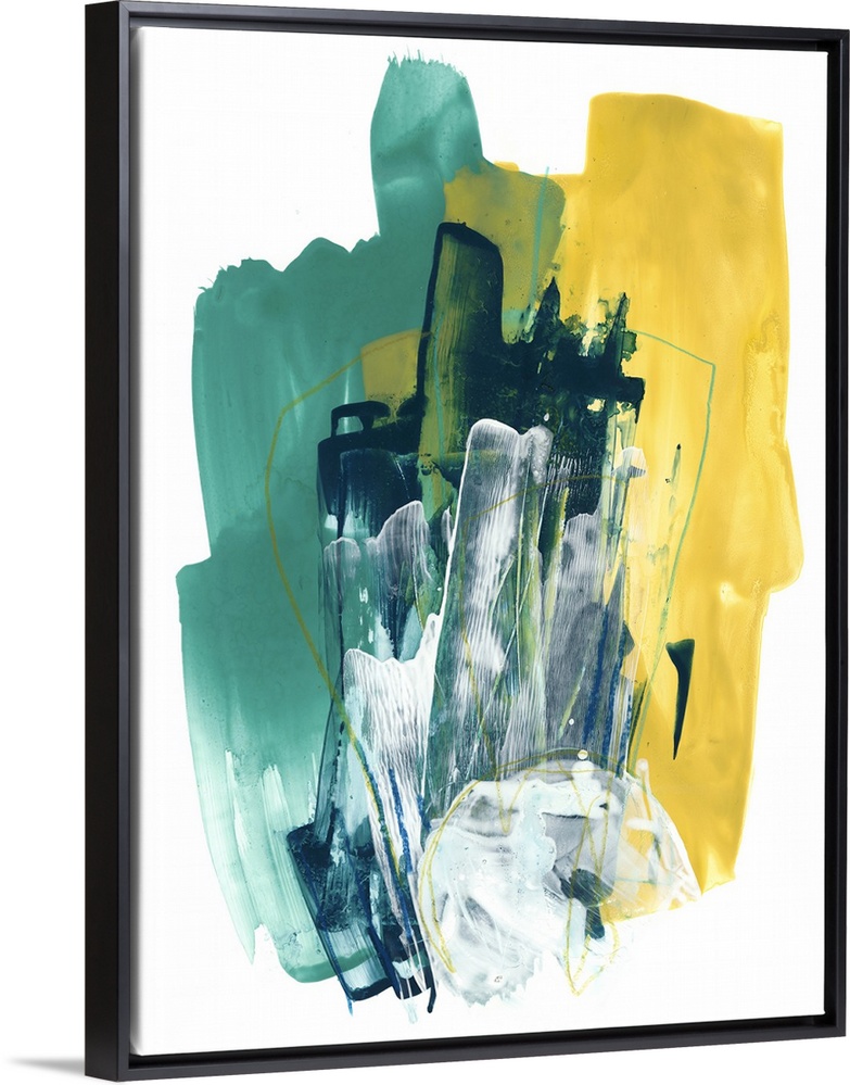 <p>Bold, upright brush strokes in teal, white and yellow layer over one another in this contemporary artwork.</p>
