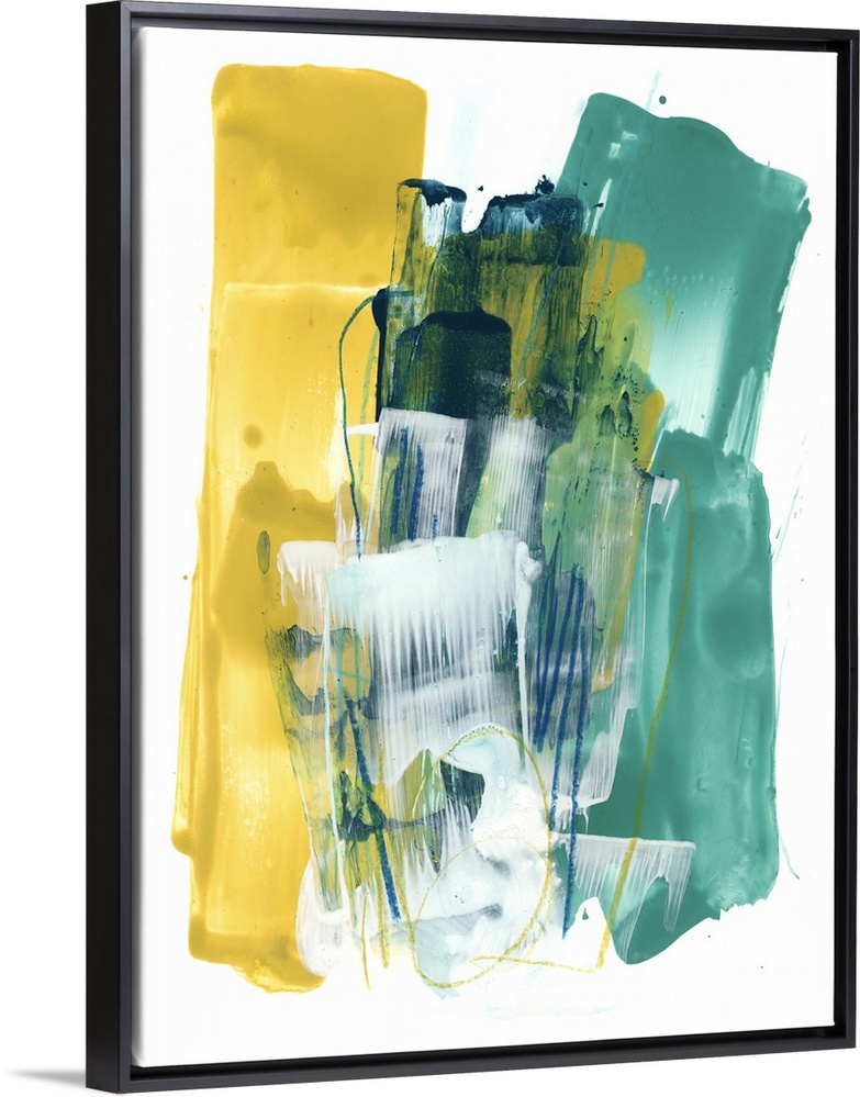 <p>Bold, upright brush strokes in teal, white and yellow layer over one another in this contemporary artwork.</p>