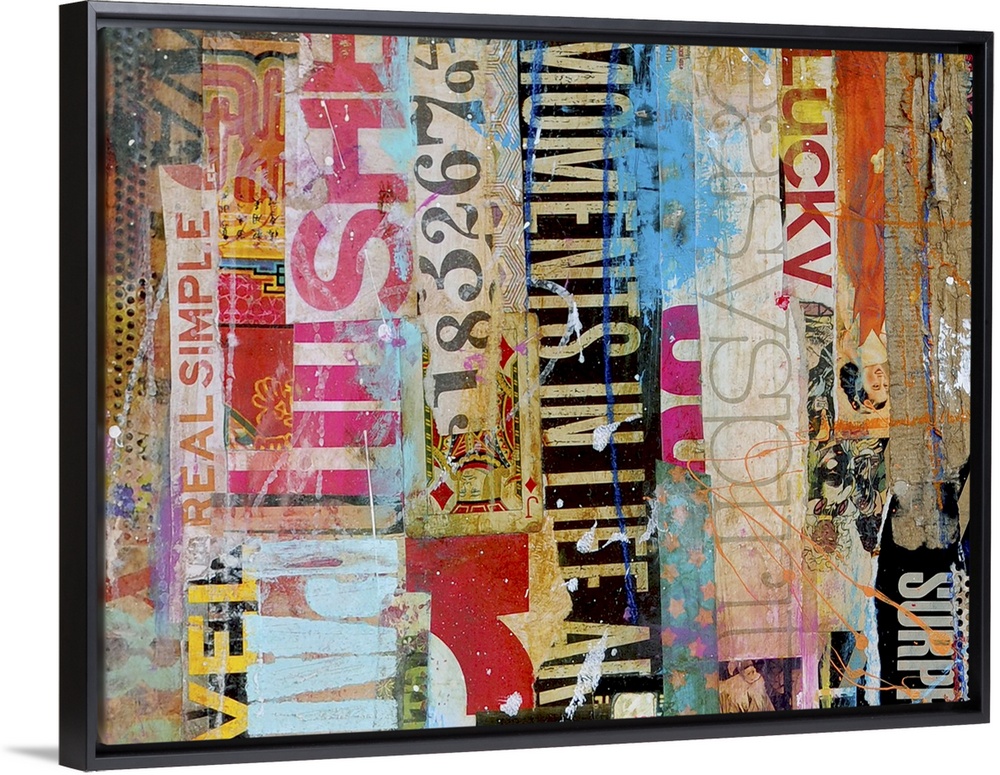 <p>Contemporary mixed media artwork composed of a variety of found text arranged vertically.</p>