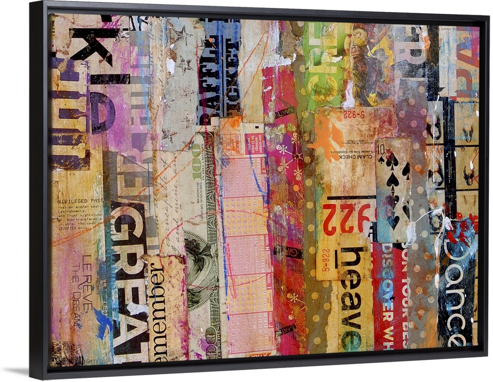 <p>Contemporary mixed media artwork composed of a variety of found text arranged vertically.</p>