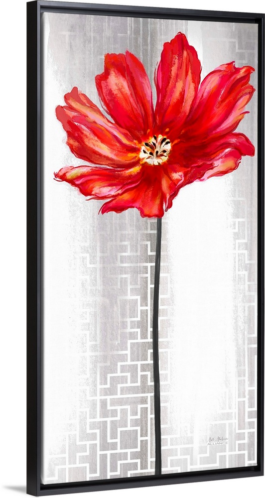 <p>Contemporary home decor art of a red flower against a silver patterned background.</p>