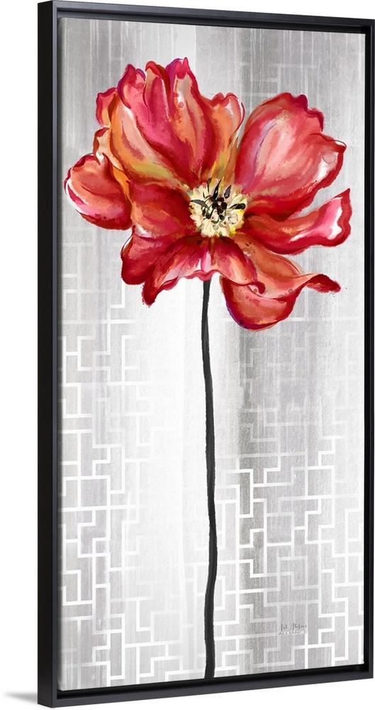 <p>Contemporary home decor art of a red flower against a silver patterned background.</p>