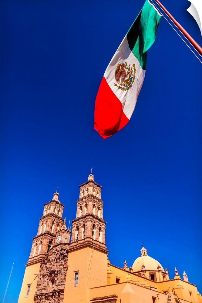 <p>Mexican Flag Parroquia Cathedral Dolores Hidalgo Mexico. Where Father Miguel Hidalgo made his Grito de Dolers starting the 1810 War of Independence in Mexico. Cathedral built in the 1700s.</p>